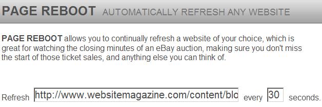 PageReboot does one thing and it works. Enter any URL and a rate of refresh, and the site will display that page, then refresh automatically on your set schedule. There is also a bookmarklet option so you can drag links to start refreshing. It's a nice resource. Some uses might include:
