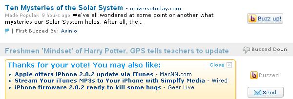 Next to the photo, you might see a Buzz logo - these are stories that have made the Yahoo home page. Hovering over the submission will reveal how many times it has been buzzed and whether you have already voted. After buzzing a story up, you get a pop-up that suggests other stories you may like and the option to email the story to friends. The email link will stay on the page after buzzing a story, should you decide to email later. Buzz a story down and the submission will be slightly compressed on the page.
