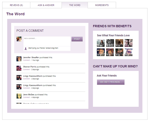 Online retailers should note, however, that the most influential review sections are interactive, informative and social. Beauty retailer Urban Decay, for example, provides site visitors with an aggregated summary of its consumer ratings at the top of its review section (image B). The summary highlights consumers' opinions on products' most important features, such as pigment, color selection, quality and ease of use. Moreover, the individual reviews offer information such as a reviewer's skin tone and eye color, which can help other customers better relate to the reviewer and trust the advice. It is also important to note that Urban Decay's product page showcases social profiles of consumers who have purchased the item, as well as enables shoppers to use social networks to ask friends for advice (image C).