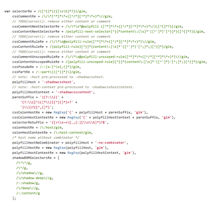 The first issue is Polymer's polyfills do not support all the functionality that Web components offer (most notably shadow DOM). Take for example, the 38-block of regular expressions, below, where this is the case (most notably shadow DOM). According to the source, "The intention here is to support only the styling features which can be relatively simply implemented. The goal is to allow users to avoid the most obvious pitfalls and do so without compromising performance significantly."