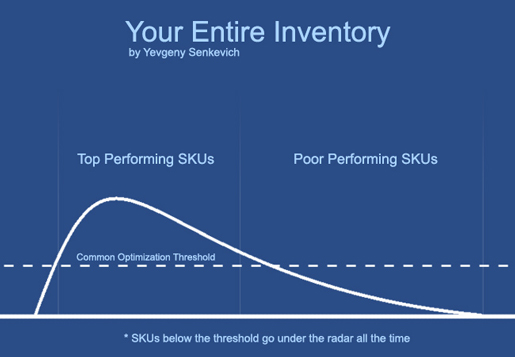 As these metrics begin to find their positive growth mediums, each SKU will stabilize and contribute to the entire store. The rest of the time is spent on reducing ineffective SKUs to pennies and increasing bids for effective SKUs which drive most of the business. Most of the inventory in a typical ecommerce warehouse does not sell well, a small percentage carry all the weight. Using an example online store, 30 percent of all inventory generates 70 percent of the revenue. The other 70 percent of the inventory in stock is responsible for 30 percent of revenue, and in some cases for 50 percent of the entire marketing spend. These long tail SKUs can be slowly sinking the whole ship.