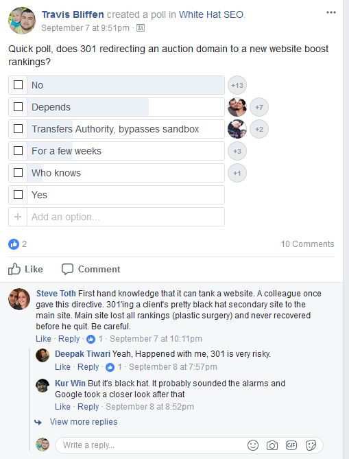 As would be expected, we even got some cautionary tales of 301 redirects gone wrong and the damage they did. That should serve as a reminder that any time you try to manipulate Google, it could backfire. If you don't understand the potential risks, don't do it. Out of the 26 people who chimed in on the poll, 13 said that this tactic does not work, which is incorrect.