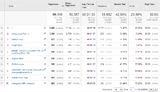 (This Pages report contains nearly 29,000 URLs. The Exclude URL Query Parameters setting can consolidate URL variations into a manageable number.)