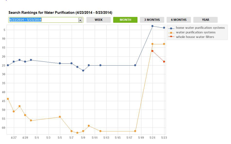 Sweetwater LLC is a small business that sells water purification systems. The content on the website is written by the business owner who is a geologist and spent several years working with river water and water contamination issues, so it is extremely unique, in depth and useful. Above you can see the rankings of his site just before and just after Panda 4.0 rolled out. Whole house water filters went from not in the top 100 to around #20, water purification systems moved up 35 places to #12, and home water purification systems jumped from 25th to #3.