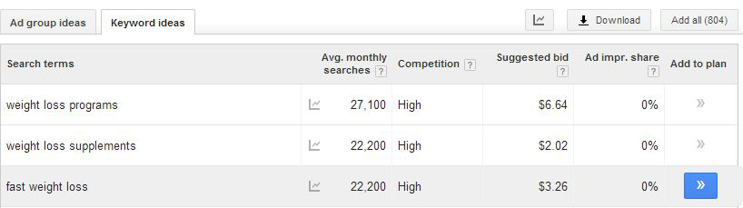 In the example site I created, I selected Venus Factor and a few other diet pills for women. I then set out to find some keywords that generated enough traffic to target. I found the following keywords to be sufficient.