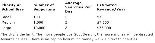 It's time to take a fresh look at GoodSearch - a search engine founded in 2005 that donates at least 50 percent of it's advertising revenue to your specified charity. In essence, every time you search, your selected charity gets a donation - about $.01 per search, according to the site. Select your charity (there are hundreds to choose from at the bottom of the home page) or enter your own, click "verify" and start searching. As long as you have cookies enabled, the site will save your charity when you return for another search, or you can choose a different charity each time. Results come from Yahoo, so you can be sure they will be relevant. The chart below shows and example of the possibilities of using GoodSearch.