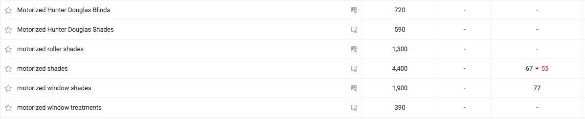 The following image shows the client struggling to rank for any motorization terms and one term had a 55 place drop for motorized shades between Nov 1st to Dec 1st.