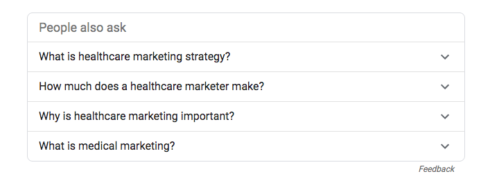 Let's say you want to rank in voice search for specific queries tied to healthcare marketing. First, you Google healthcare marketing. Second you see the long for questions people have for a specific term (Google updates these questions frequently by the way, so keep a close look on them). At the time of writing, here's what we found: