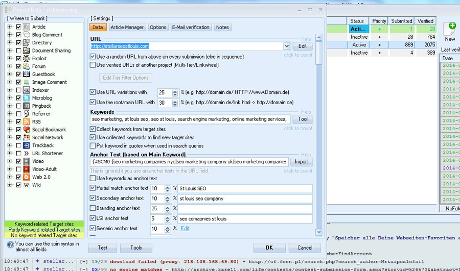 In setting this up, I created the worst campaign I could. Only spun content was used for the links and I allowed links to be built on pages ranging for PR n/a and higher. The primary keyword is St Louis SEO and as you can see above, it was used for only a small percentage of the links. Other variations of the term such as STL SEO, and long tail terms like St Louis SEO Companies where used in addition to naked URLs and generic anchor text.