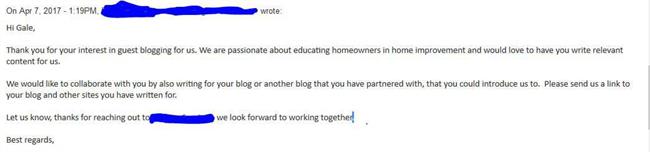 In exchange for publishing a guest post, this person asked if we could connect them to a blog we owned or had worked with in the past so that they too could promote their website via guest posting. While a reciprocal link swap is not recommended, putting the webmaster in touch with a third-party site can help both the site owner and the person asking for the link initially.