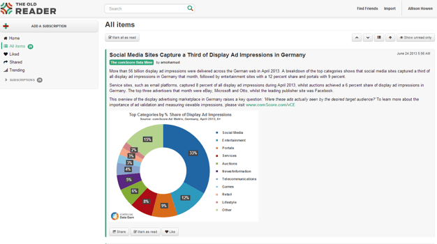 Another RSS feed worth considering is The Old Reader, which takes a simple, yet social approach. The platform is modeled after the original Google Reader, which makes its layout very similar to Google's familiar service. The Old Reader enables users to connect with friends through the platform by either manually typing in names or by searching through users' Facebook friends and Google contacts, as well as gives users the ability to share and comment on content and import subscriptions. It is important to note, however, that the platform is currently without a mobile app.