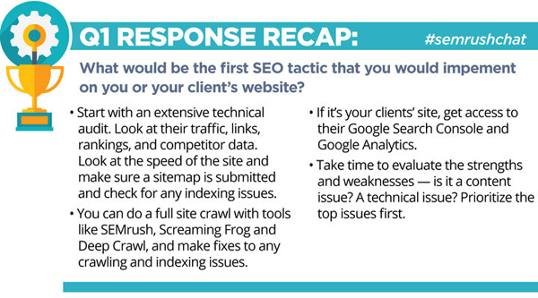 Marketing software company SEMrush hosts engaging Twitter Chats surrounding the many aspects of SEO. Not only does the company benefit from the real-time interaction on Twitter, but they are also able to compile the insights provided into blogs and graphics. SEMrush chooses responses to include in their blogs and creates recaps for the answers to each of their questions.