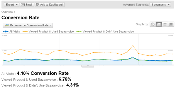 With the integration, according to Bazaarvoice Product Manager Andy Wolfe, "clients can now see, in Google Analytics, the metrics on things like the number of visitors paginating through reviews, or sharing user-generated content with social networks, or clicking on related products found in reviews. Advanced Segments can then be used to compare the behavior of visits that interact with Bazaarvoice generated content vs. those that don't."