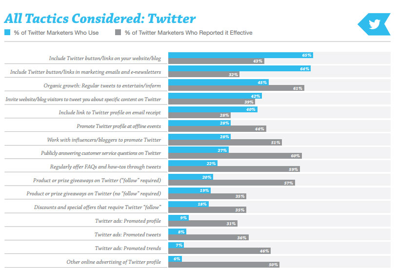 The most used Twitter tactic among respondents was including Twitter buttons and links on a website or blog - 65 percent of marketers used this tactic with 43 percent reporting it as effective. The tactic of including Twitter buttons and links within marketing emails and newsletters was used by 64 percent usage respondents but just 32 percent found it effective.