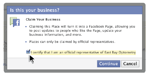 The next step is to actually claim your place which will allow you to manage your address, contact information, business hors, profile pictures, administrators, etc. Facebook Places is very similar to managing a Facebook Page, but with additional functionality like Maps, directions, and of course check-ins. To claim the business as your place, you must: