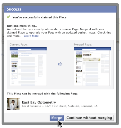 Is that all there is? Nope, now you get to merge your Facebook Place with your existing Facebook page.