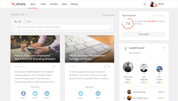 Using the pulls of gamification, employees accrue points for each share, which are tallied in a company-wide leaderboard and can be redeemed for swag or other rewards.