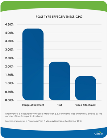 - Most Effective Post Type: Across all brands and represented business verticals, image posts are more engaging as measured by fan responses, likes and shares than video or text.