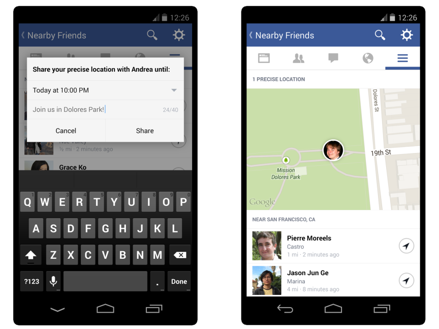 There are a few popular location-sharing apps already on the market such as Path, Twitter has it's "nearby tweets" function, "Find My Friends" is exclusive to Apple, not to mention Grindr, Tinder and Foursquare. With Foursquare the attention has primarily been on neighborhood exploration and discovery. You receive badges for getting out and trying new things, being in certain areas, rewards like "Mayor" for checking into certain places a number of times, etc. Recently however, Foursquare launched a new app called Swarm which is essentially the same functionality as Facebook's nearby friends, the focus now being on social interaction and making it easier to link up with friends in the area. In similar fashion you have the ability to determine your level of visibility to other Swarm users, as well as toggle between sharing and not sharing, and their signature "Check-in's".