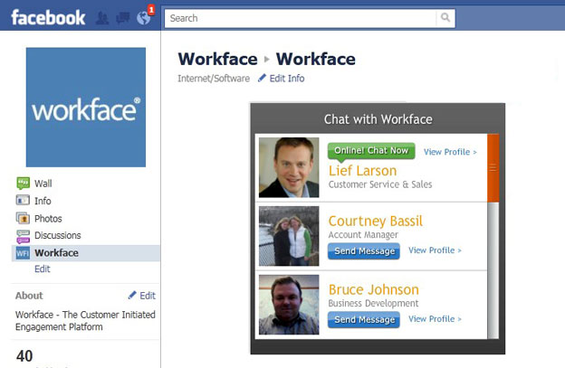 "In Facebook, you can chat with individuals who are your friends, but you can't chat with a company," explained Larson. "With Workface in Facebook, prospects can select an individual from an organization and engage in a conversation without having to make the commitment of 'liking' them. The added bonus is that the prospect can learn about the background and expertise of the company rep they're interfacing with in a way that's much more personal and rewarding than traditional, faceless online chat."