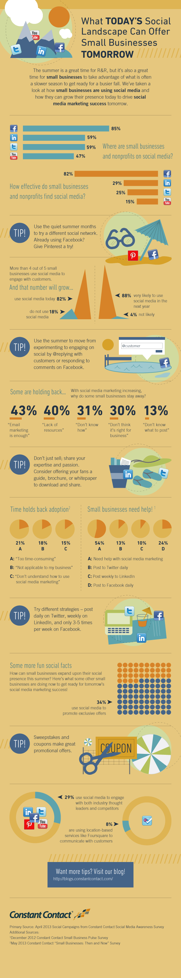 Lastly, the infographic offers some tips for how SMBs can leverage social media this summer to grow their audience base, such as using slower months to test a new social network like Pinterest, trying different posting strategies or to experiment engaging with audience members on Twitter with @replies and responding to Facebook comments. Plus, Constant Contact recommends that small businesses shouldn't just use social to sell their products, but to also share their expertise by offering content like brochures, whitepapers or guides.