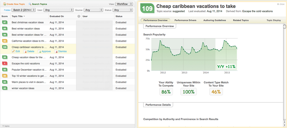 By leveraging the new InboundWriter software, writers can identify the factors that determine the success of an article before it is written and review the projected performance of an article topic in terms of the traffic it will drive to a given website. Plus, the software provides a menu of related topics that enables writers to better balance editorial goals with expected performance, as well as provides guidance on title and content composition without disrupting the writing process. Advanced users also have access to analytics and data regarding the root cause of projected topic performance, including insights on reader demand, competitive content, topic uniqueness and optimal content type for specific content.