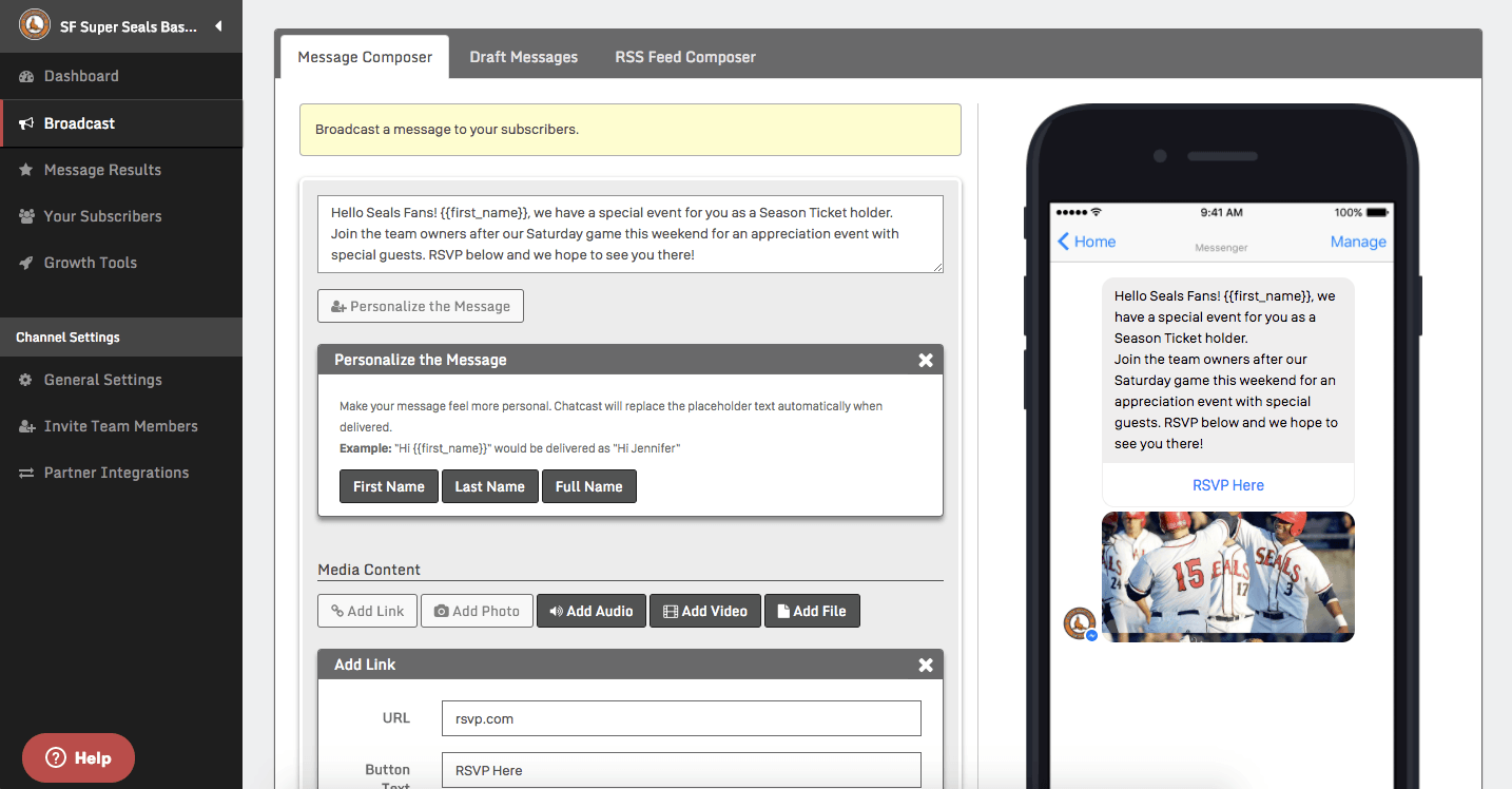 Chatcast's Composer feature makes it possible for marketers to create, preview, schedule and send messages through the platform.