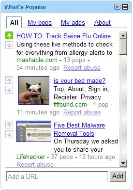 While Google is, of course, mum on the details of what makes a certain submission "popular," it's safe to assume there are a number of individual factors working as a whole. Google likely takes into account the number of links pointing to the submitted page, user votes (pops) on the gadget and number of times the URL has been submitted, among other factors. So, it would make sense that the more your URL is submitted and voted on, the better chance of landing in a good position on the gadget. As you might expect, submissions look to be filtered by recency and relevancy, such as "HOW TO: Track Swine Flu Online" being at the top of the results all day, as of this writing.