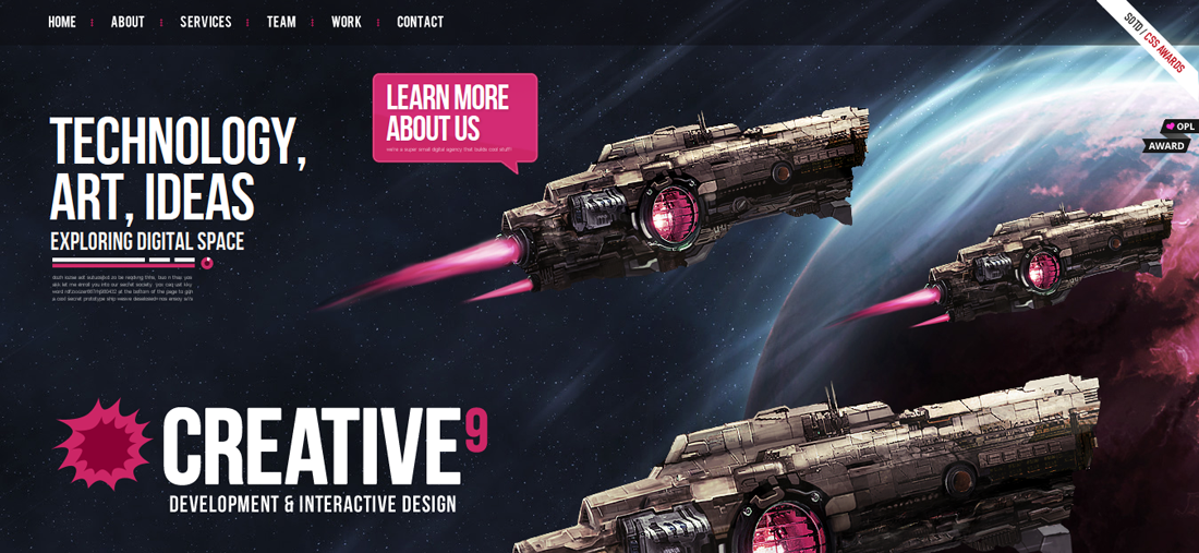 Alright you hate simplicity and want some inspiration to push the creative envelope! I get you. Get inspired from Creative 9 website. The design revolves around a galaxy motif replete with space ships. Super cool colors, graphics and just pure unhindered imagination have helped craft an award winning site.