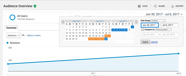 Secondly, you will want to get familiar with how to compare data against a certain period whether that be last week, last month, or last year. Do this by clicking on the date range in the top right hand corner, select 'compare to', and choose the period in question.