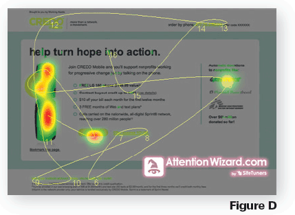By contrast, the final page (figure D) shows controlled gazing focused on the phone, and the call-to-action button. After briefly scanning the logos of the progressive causes that CREDO supports ('social proof' that provides a 'halo effect' by association), the eye returned to the round offer call-out and the phone. The call-to-action button is one of three red attention "hot spots" on the page.