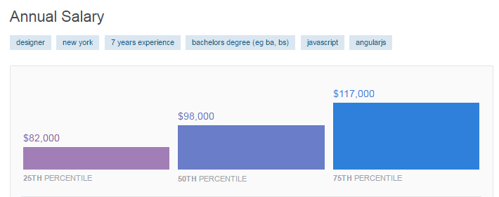 The salary for a designer with seven years of experience in New York, with a bachelor's degree and some skills in JavaScript, for example, could be earning anywhere from $82,000 to $117,000 based on the Stack Overflow data (see chart below). One of the other interesting features of the new tool is that not only will it show annual salaries, but will also offer up a few jobs where developers might be a good fit based on the information provided by developers.
