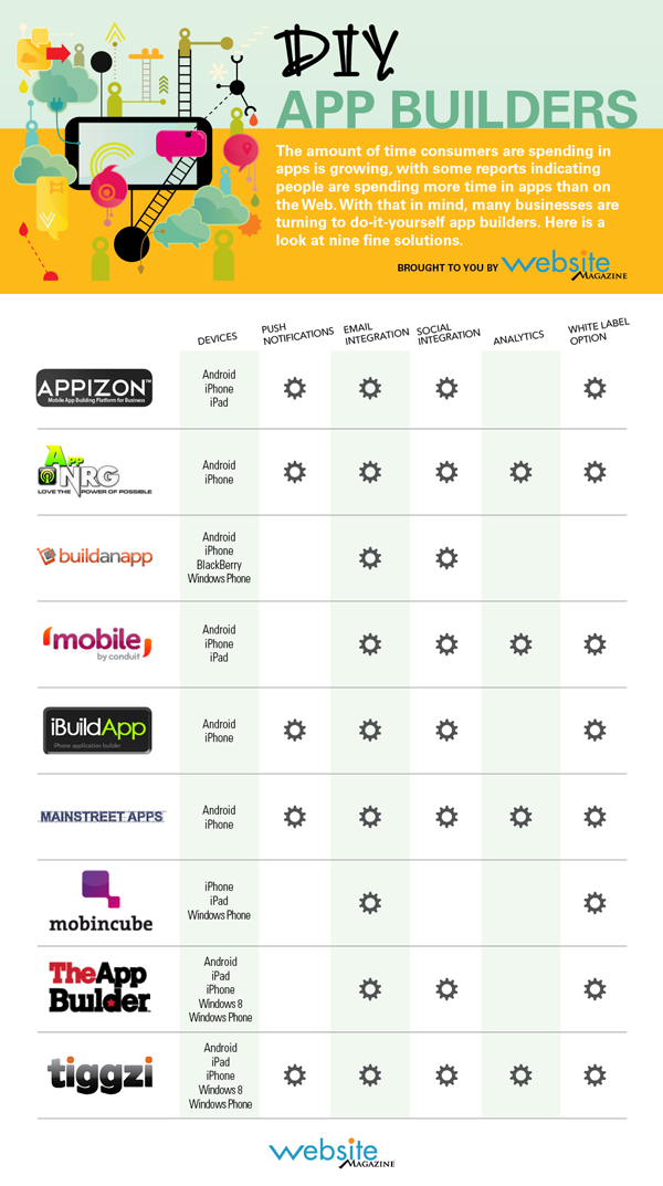 Many businesses want to capitalize on this consumer shift, but don't know where to start. While there are many mobile-website building companies, this Website Magazine infograph is meant for DIY app builders only. Happy building!