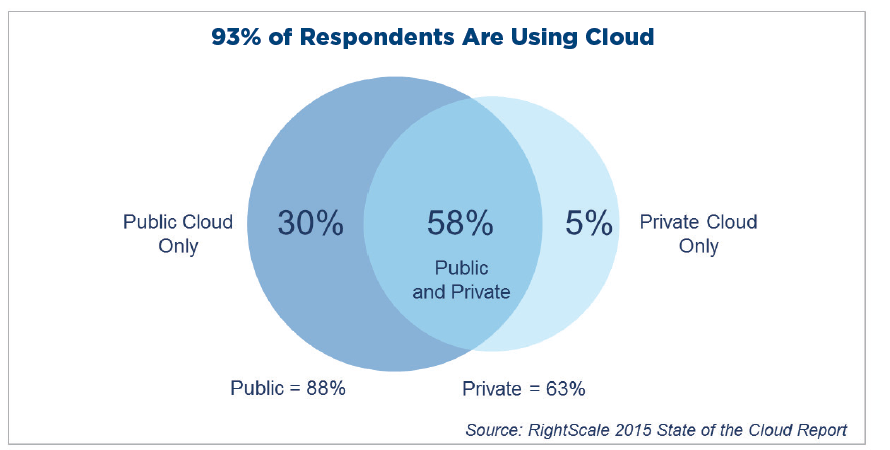 RightScale's annual State of the Cloud Survey indicates that while the private cloud currently leads in workloads, public cloud leads in enterprise adoption with 88 percent of organizations using public cloud compared to 63 percent who are using private cloud.