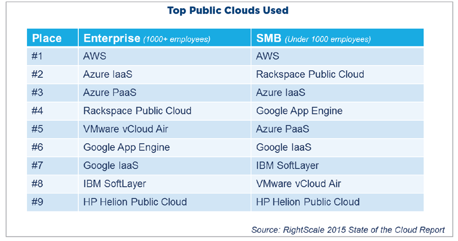 What's more, the study found that private cloud adoption is expected to stall in 2015 with only small changes in adoption. This may be because numerous industry experts are reiterating that the public cloud has a better cost advantage and better availability. Finally, enterprises continue to flock to Amazon Web Services (AWS), accounting for 57 percent of those using the public cloud, followed by Azure IaaS at 12 percent.