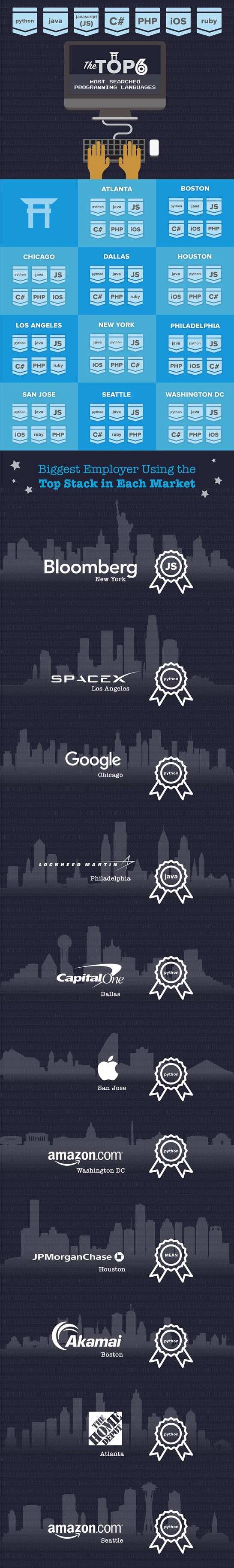 Programmers in New York for example that know their way around JavaScript and the MEAN stack (MongoDB, ExpressJS, AngularJS and Node.js) may find themselves at a company like Bloomberg. While those skilled in Python could head over to SpaceX while those in Chicago could soon call themselves Googlers.